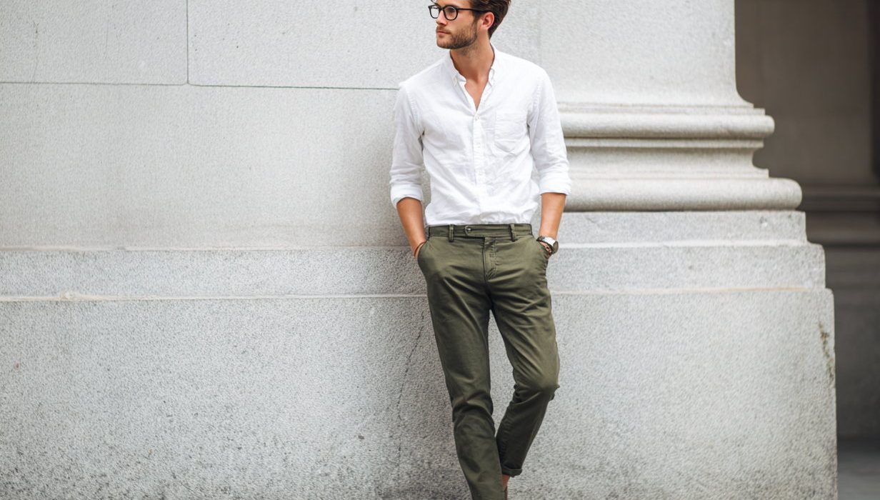 Olive linen offers a softer alternative to navy or black while maintaining a sense of utility. Pairing these trousers with a white linen shirt emphasizes the breathability of the entire ensemble.