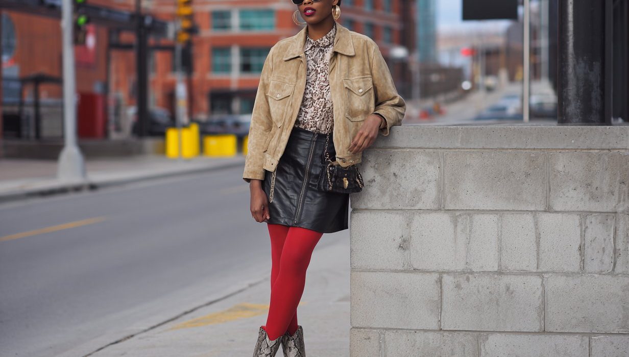 The first option we propose is to wear red tights, perfect when paired with a pair of python boots, following the fashion trends of the moment. The boldness of this combo is then echoed in the material of the clothing suede jacket and black leather miniskirt. The accessory that makes the difference? The chocolate-coloured gloves.