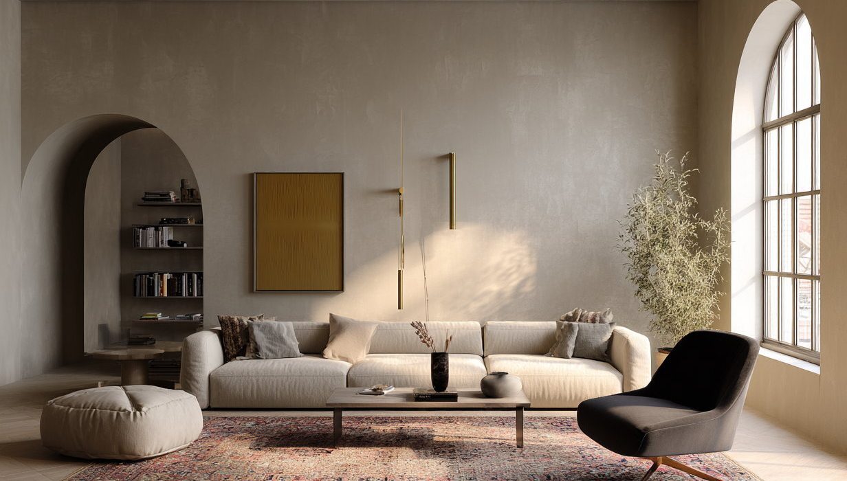 - For example: Arched passageways, crescent-shaped sofas, and wave-like walls that soften the room’s rhythm.